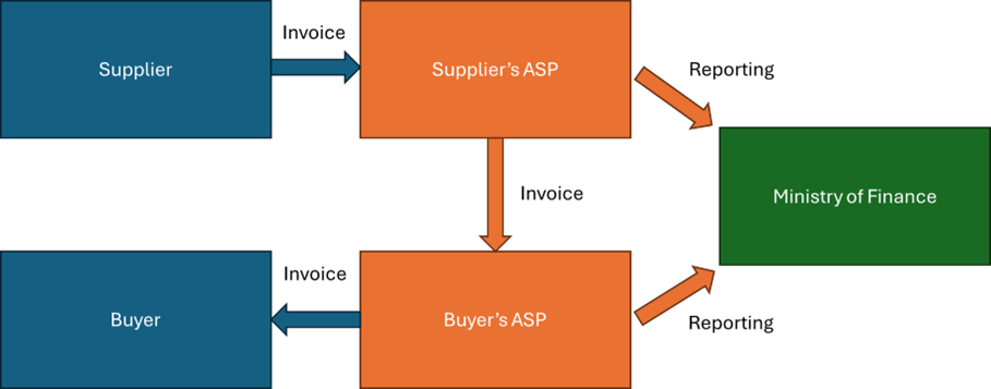 - Accredited Service Providers (ASPs) authorized by the MoF, acting as intermediaries who validate, transmit, and report e-invoice data.